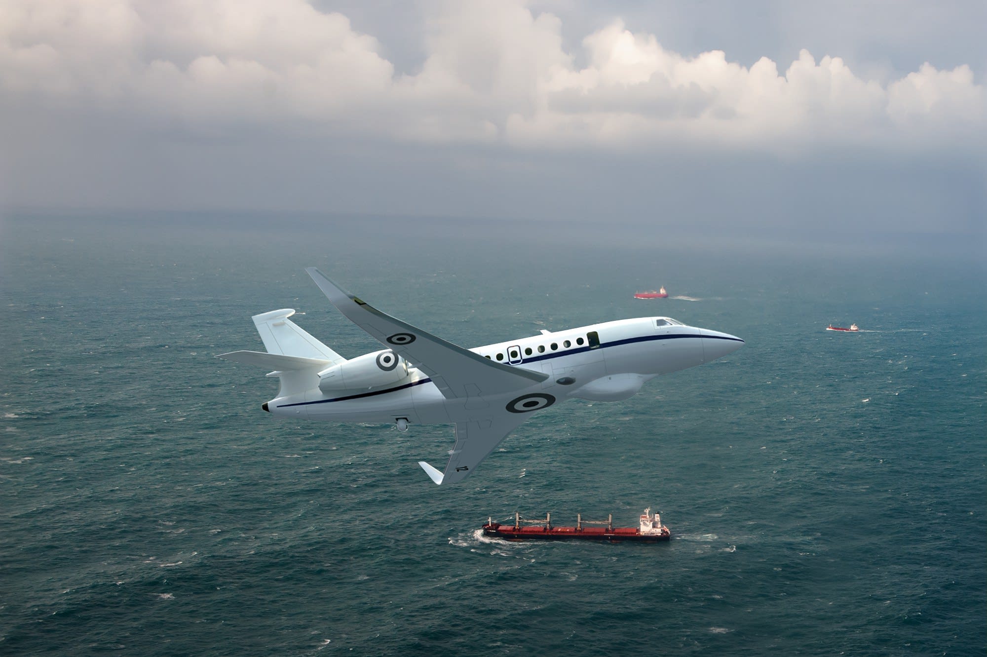 The Falcon 2000 MRA (Multi-Role Aircraft) is designed for surveillance, reconnaissance missions, anti-surface warfare, electronic warfare, and fleet training.